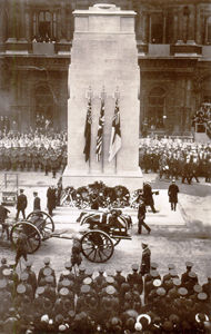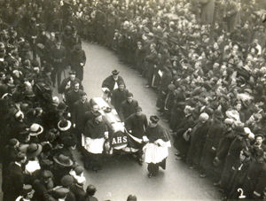 In October 1920 the London Centre of the British Undertakers’ Association was contacted by the Ministry of Works for assistance with the bringing home of the body of the Unknown Warrior. The president of the BUA was H Kirtley Nodes of John Nodes in Ladbroke Grove and together with the London secretary, the Revd John Sowerbutts, they accompanied the coffin to and from France. Wood for the coffin was sourced from the grounds of Hampton Court Palace and it was constructed at Ingall, Parsons, Clive & Co’s Forward Works at Wealdstone in north west London. The coffin was a ‘gift of appreciation’ to the nation from members of the BUA who each subscribed one shilling. As the coffin on a gun-carriage passed down Whitehall on the way to Westminster Abbey, George V pressed a button to release the flags covering the newly-constructed Cenotaph.