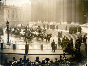 The funeral at St Paul’s Cathedral of the three policemen shot during a raid of a jewellery business in Houndsditch in December 1910. The incident led to the infamous ‘Siege of Sydney Street’. Sergeants Bentley and Tucker and Constable Choate were posthumously awarded the King’s Police Medal. The two sergeants were buried in the City of London Cemetery at Ilford and Constable Choate at Byfleet in Surrey.