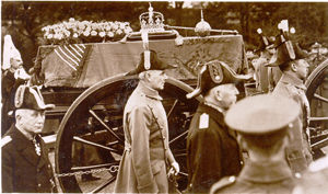 George V died on 20 January 1936 at Sandringham. His coffin was taken by train from Wolferton to King’s Cross, then to Westminster Hall for lying in state. W Oliver Nodes, first President of the British Institute of Embalmers, assisted Mr LV Weaving of William Garstin funeral directors in Marylebone with the embalming.