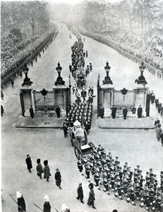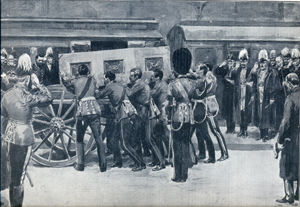 Queen Victoria died at Osborne House on 22 January 1901. Ten days later her coffin was transported from the Isle of Wight across the Solent to Gosport where it was taken by train to London. At Victoria station, twelve men of the Guards and Household Calvary placed the coffin upon a gun-carriage for the journey to Paddington (pictured here). The appropriately named Royal Sovereign locomotive then hauled the royal train to Windsor. After a service in St George’s Chapel, the coffin was moved to the Albert Memorial Chapel where it remained until the afternoon of Monday 4 February when interment took place next to Prince Albert in the royal mausoleum at Frogmore. The funeral furnishers W Banting of St James’s were engaged to assist with the funeral, with the equally historic firm of JD Field also making a significant contribution.