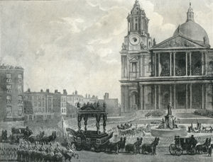 Lord Nelson’s lying in state took place at Greenwich Hospital before a flotilla transported the coffin to Whitehall Stairs. From there it was taken to the Admiralty. On 9 January the procession made its way from Westminster via the Strand and Fleet Street where it entered the City at the Temple Bar gate before moving towards Ludgate Circus and finally to St Paul’s. After a service in the Cathedral the coffin was lowered into the grave located in the central space under the dome.