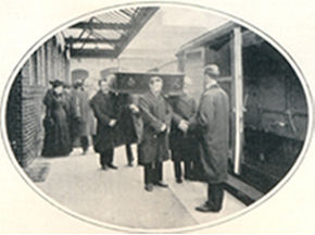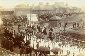 Dr Thomas John Barnardo was born in Ireland in 1845, and his name is still remembered today. Working in the East End during a cholera epidemic he procured a room in Stepney and stared to teach ‘rough, ragged boys of the district’. Homes were established in London, including the Girls’ Village Home at Barkingside. Following his death on 19 September 1905 his coffin lay in state at the Edinburgh Castle Mission Hall in Limehouse. A lengthy procession, headed by the band of the Stepney Boys’ Home, preceded the coffin to Liverpool Street station for the journey to Barkingside. After cremation, his ashes were buried beside the Children’s church. This image shows the scene at Barkingside station.
